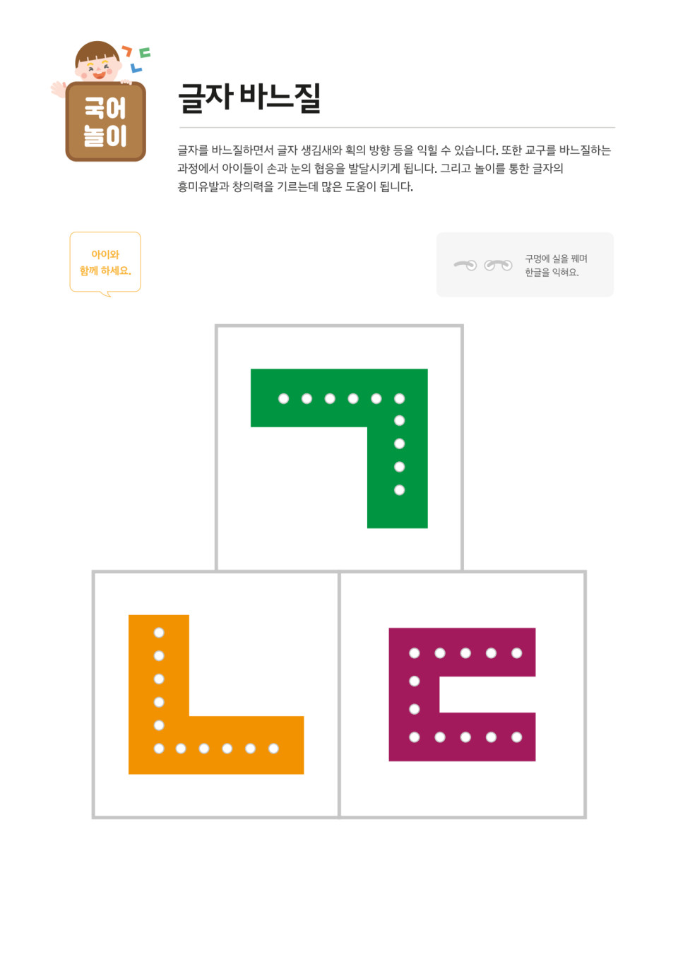 가정에서 바느질하는 모습을 본 아이들은 호기심을 느끼고 모방하려는 모습을 보이기도 하지요. 이러한 호기심을 자극해 스스로 바느질을 하며 자음 또는 모음자를 구별해보는 언어놀이입니다.