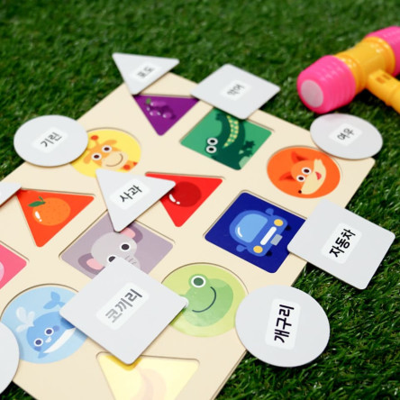 뿅망치로 퍼즐을 힘껏 내리치자 들리는 재미있는 소리와 뿅망치에 철썩 붙는 모습이 스트레스를 해소시키고, 퍼즐 색과 같은 색을 가진 그림을 살펴보며 인지 발달이 이루어집니다.