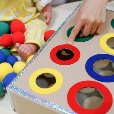 3. 상자를 보여주며 폼폼이와 같은 색깔 구멍을 찾아 넣어보도록 합니다.