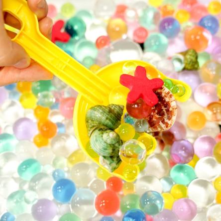 1. 딱딱한 조개와 다른 놀이 재료 - 예시) 탱글탱글한 수정토의 촉감을 감각적으로 비교하며 두뇌 발달을 도와요