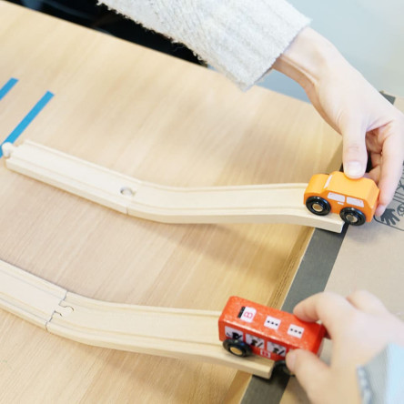 [원목 기차놀이 세트]는 각각 다른 길이의 레일을 연결하여 만들 때마다 새로운 기차놀이 공간을 구성할 수 있으며, 더 많은 것을 상상하고 표현할 수 있는 구성물들이 포함되어 있답니다.