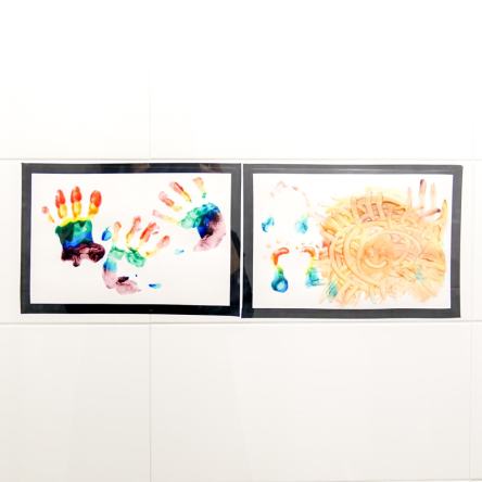 벽에 종이를 누가 더 높이 손도장을 찍는지 시합하며 놀이해보세요.