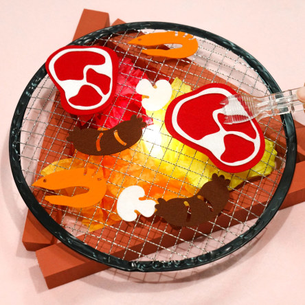 - 펠트 캠핑 음식(고기, 새우, 소시지, 버섯 각 2개씩), 둥근 석쇠 1개, 절연 테이프 1개, 놀이 집게 1개