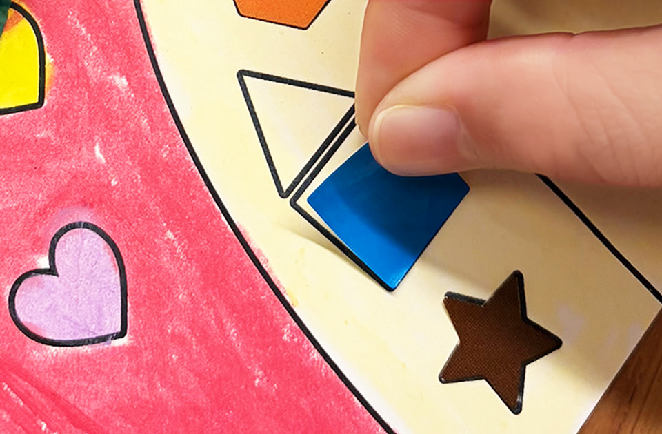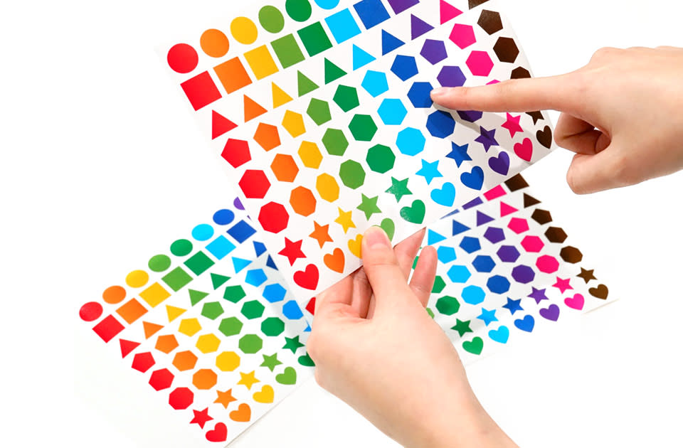 도형스티커 ①은 '원형, 삼각형, 사각형, 오각형, 육각형, 팔각형, 별, 하트'와 같이 총 8종의 도형으로 총 80개의 스티커로 구성되어 있습니다.