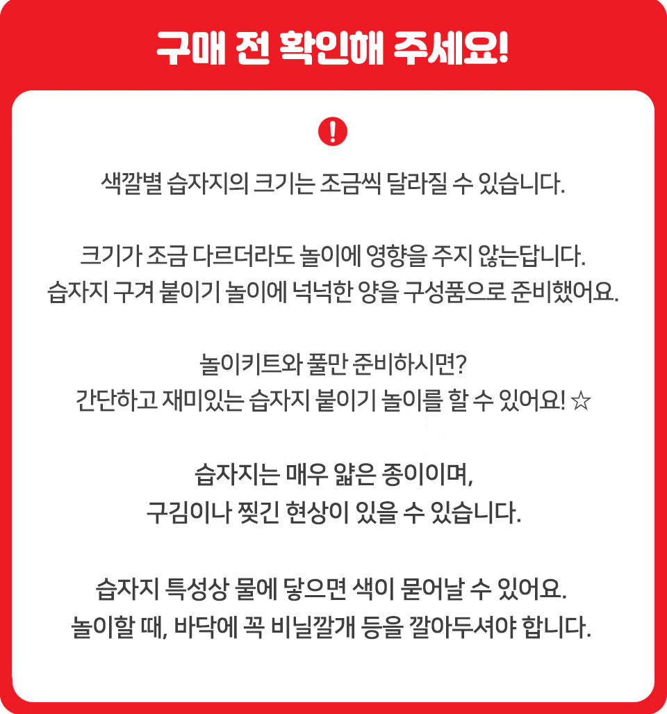 놀이 재료 보관과 놀이 과정, 놀이 후 처리까지 아이가 안전하게 놀이에만 집중할 수 있도록 보호자분께서 각별히 신경써서 안전 지도해 주세요.