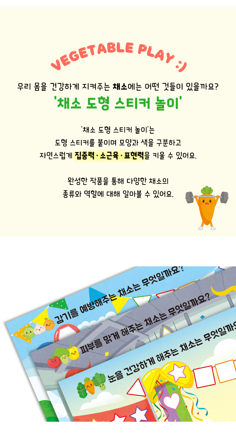 💛 활동지는 '감기를 예방해 주는 채소는 무엇일까요?', '피부를 맑게 해주는 채소는 무엇일까요?', '눈을 건강하게 해주는 채소는 무엇일까요?' 총 3가지 테마로 구성되어 있습니다.