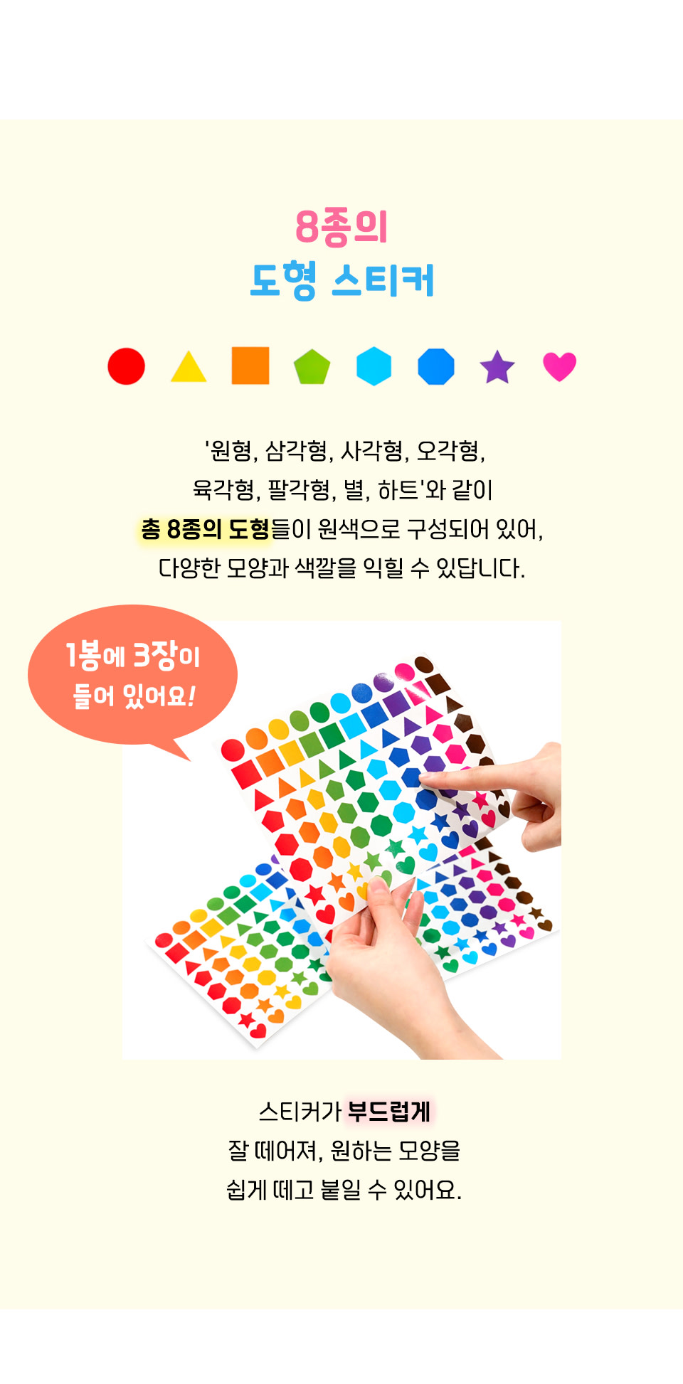 💛 도형 스티커 ①은 '원형, 삼각형, 사각형, 오각형, 육각형, 팔각형, 별, 하트'와 같이 총 8종의 도형으로 총 80개의 스티커로 구성되어 있습니다.