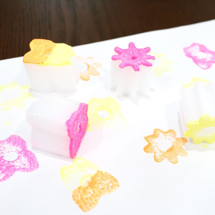 2. 꽃송이 폼 스탬프로 여러 가지 색깔 무늬를 만들며 상상력과 창의력을 키워줘요.