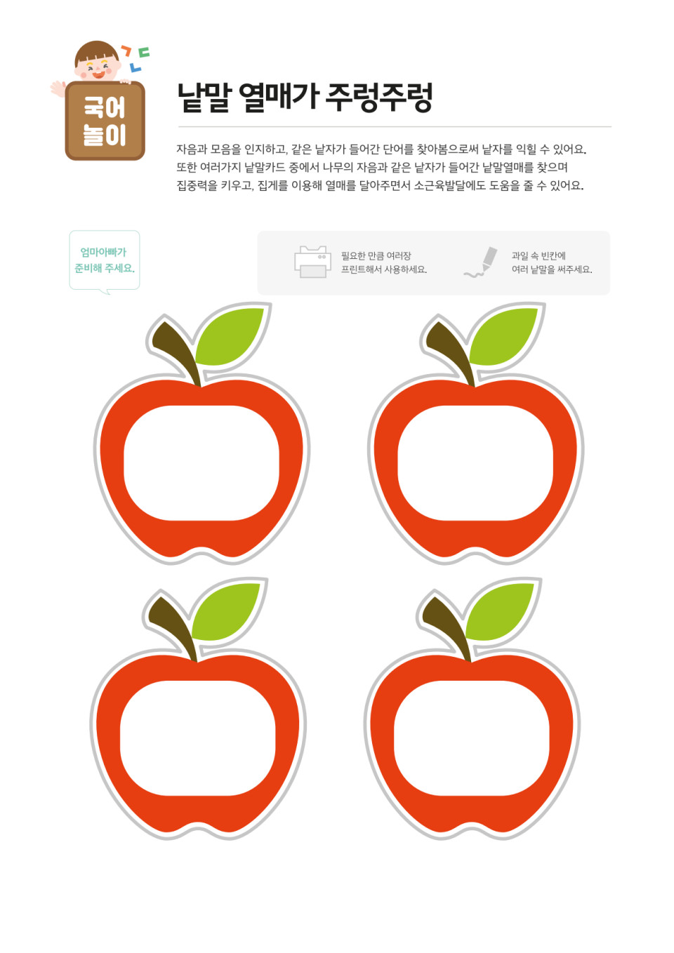 *놀이할 때는 아이의 한글 인지 정도를 고려하여 받침이 없거나 쉬운 단어부터 시작하는 것이 좋습니다.