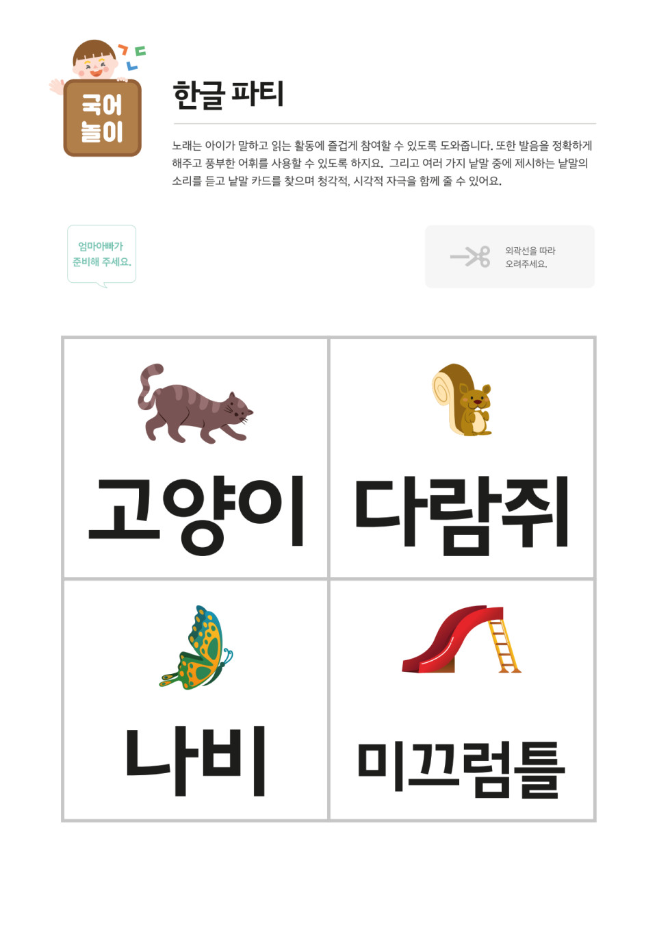 ![]() | 그래~ 그럼 아빠가 만화 노래 틀어줄게. 노래가 들릴 때는 춤을 추다가 멈추면 아빠가 보여주는 카드를 잘 보는 거야. 카드 안에 있는 모양의 자음이 들어간 낱말카드를 바닥에서 찾아주면 된단다. 그럼 노래 시작~! |