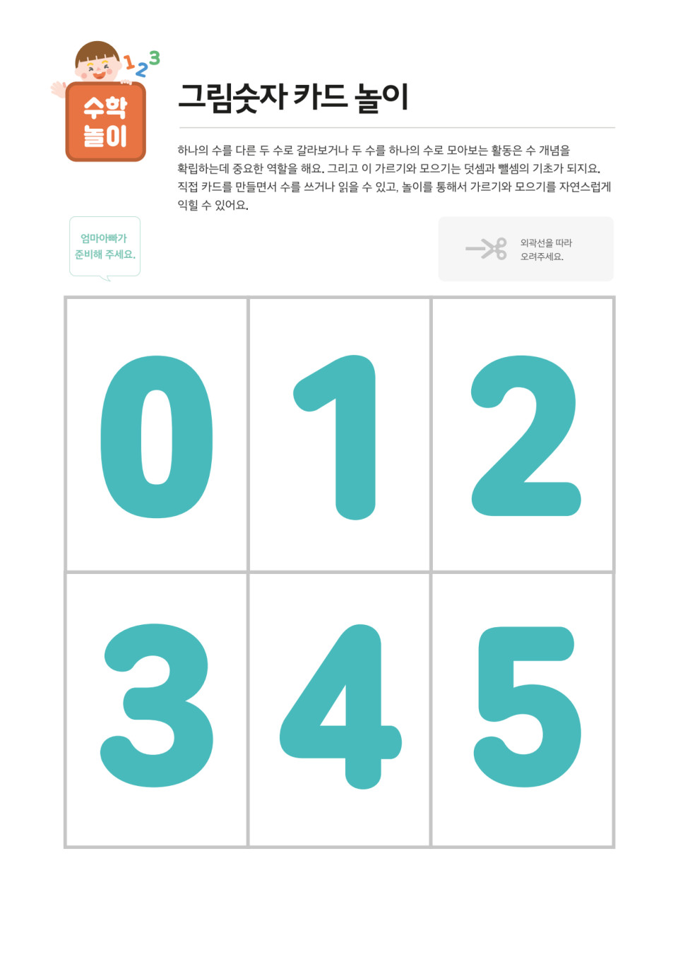 직접 카드를 만들면서 수를 쓰거나 읽을 수 있고, 놀이를 통해서 가르기와 모으기를 자연스럽게 익힐 수 있습니다.