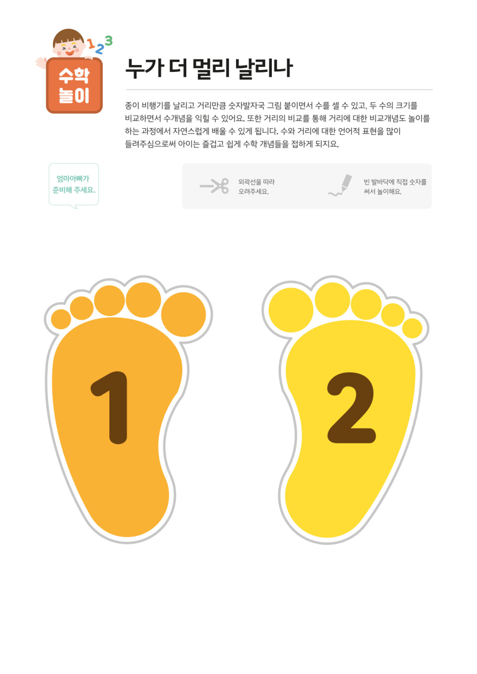 종이비행기를 날리고 거리만큼 숫자 발자국 그림을 붙이면서 수를 셀 수 있고, 두 수의 크기를 비교하면서 수개념을 익힐 수 있습니다.
