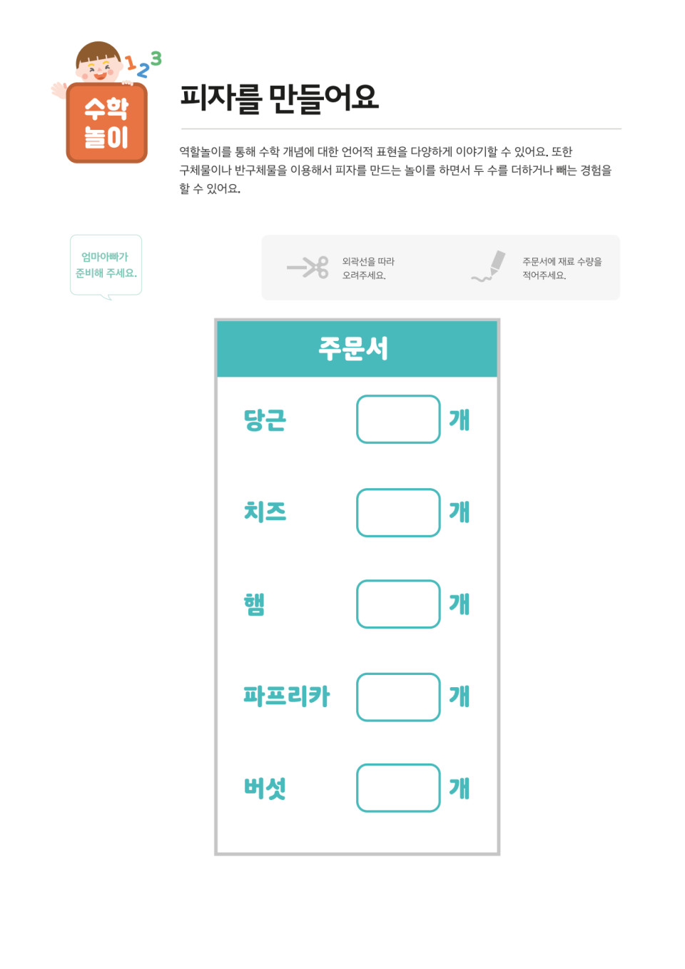 2. 주문서라고 적은 도화지에 간단하게 토핑으로 올릴 재료들의 숫자를 적어서 요리사에게 줍니다.