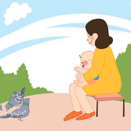 - 아기가 새를 발견하면 아기를 품에 안고 새가 있는 곳으로 이동합니다.