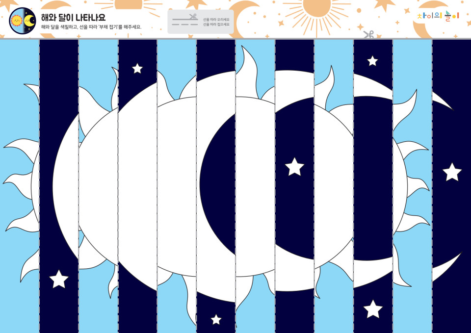 - 완성된 활동지를 좌, 우로 움직이며 나타나는 '해와 달' 그림을 감상합니다.