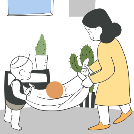 - 샤워 커튼을 열고 닫으며 까꿍 놀이를 반복합니다.