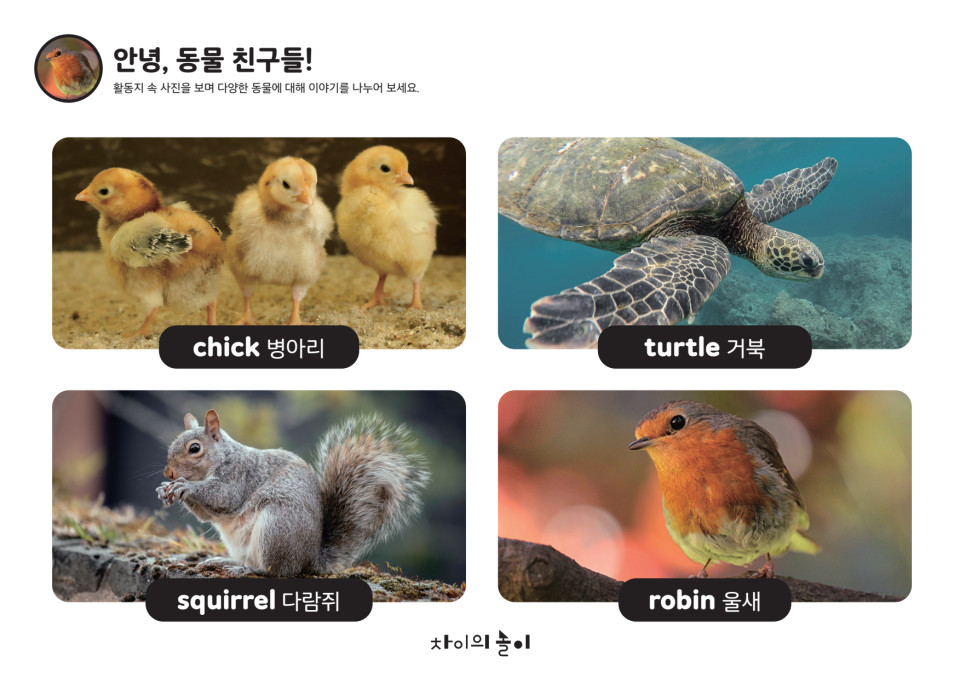 ![]() | (활동지 속 사진을 가리키며) 그림책에서 보았던 병아리(chick)랑 똑같이 생겼네. |