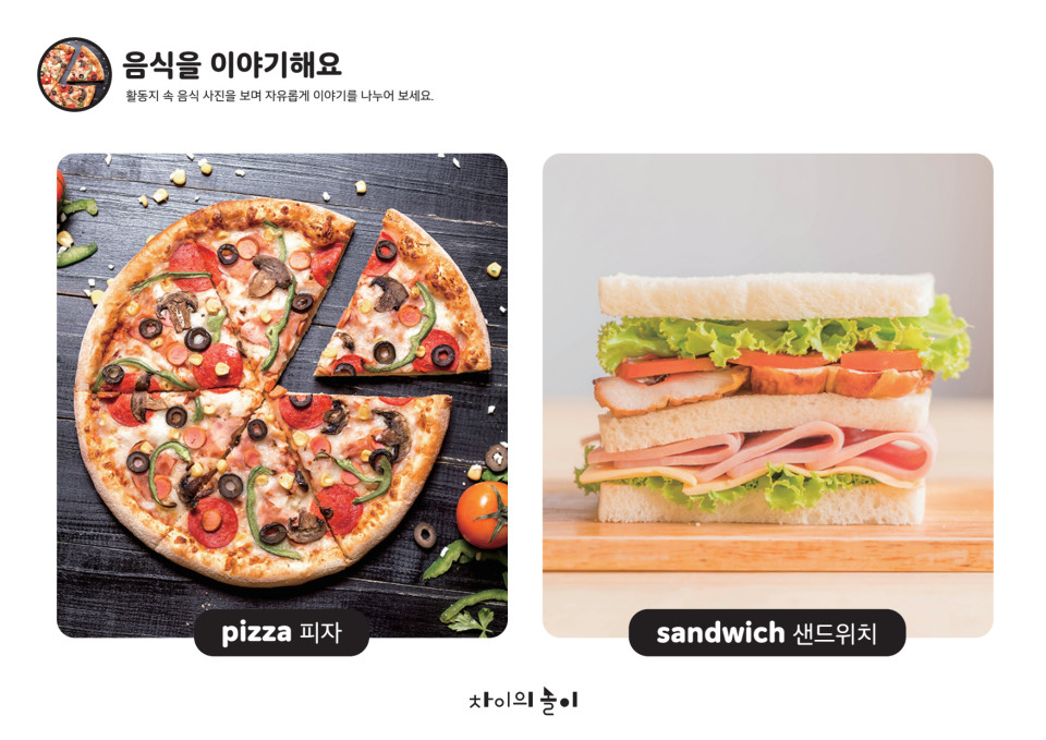 - 활동지 속의 음식 사진을 보여 주고, 책 속에서 같은 그림을 찾아봅니다.활동지 속 사진을 잘라 벽면에 붙이면 플래시 카드처럼 활용할 수 있어요.