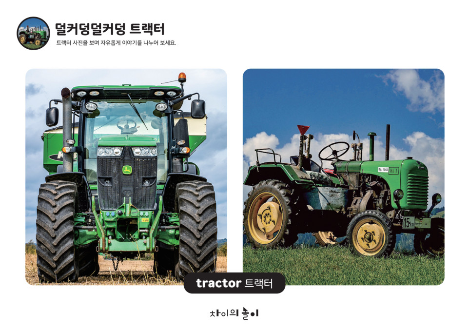 - 활동지 속 사진을 보며 트랙터의 생김새와 특징 등에 대해 이야기해 줍니다.