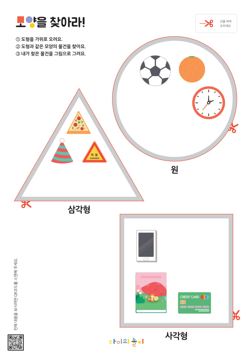 활동지(차이의 놀이에서 단독 기획 제작 판매하는 놀이 키트 자료), 도형 스티커, 첨부한 무료 활동지 자료 (모양을 찾아라! 무료 활동지를 다운로드 받아 함께 사용해 보세요!) 놀이 방법