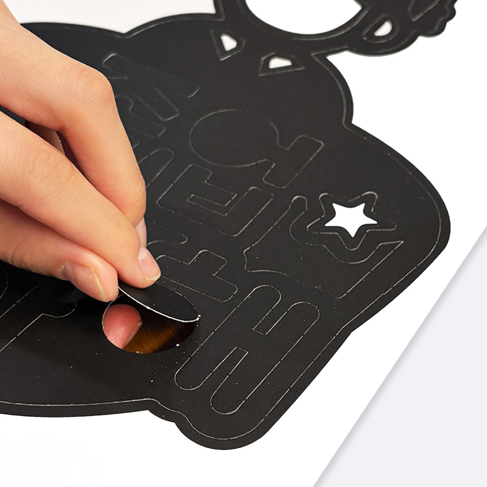 - 떼어낸 도안을 코팅지에 붙입니다. (검은색 테두리가 끈적이는 면에 붙도록 해 주세요.)
