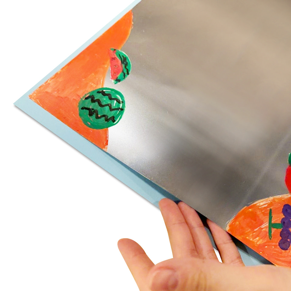 - 거울지에 덮힌 보호 필름을 떼어 냅니다.거울지에 얼굴을 비추어 보며 흥미를 유발해 주세요.