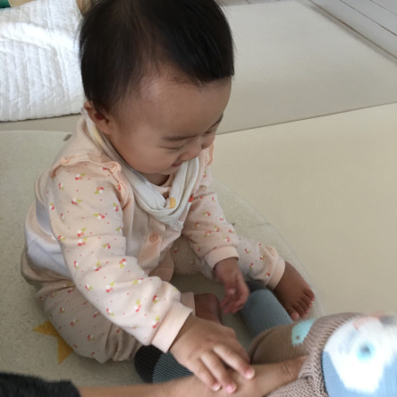 ![]() | (아기가 양말 공을 쥐면) 우리 차이가 양말 공을 잡았구나. |