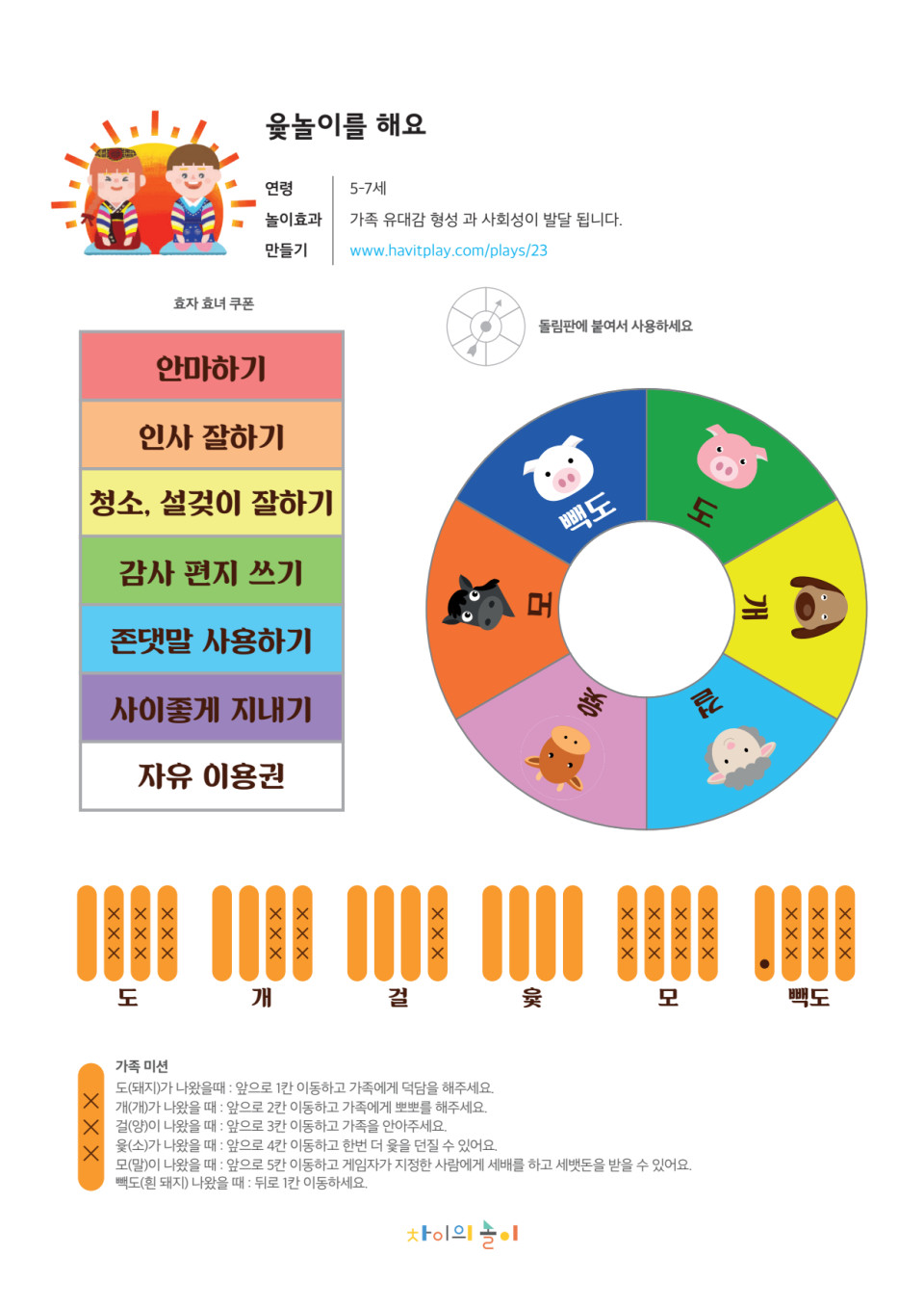 - 윷이 없을 때는 활동지 속 돌림판을 동그란 하드보드지 위에 붙이고 쇠단추 재료를 사용해 완성해서 놀이해 보세요.