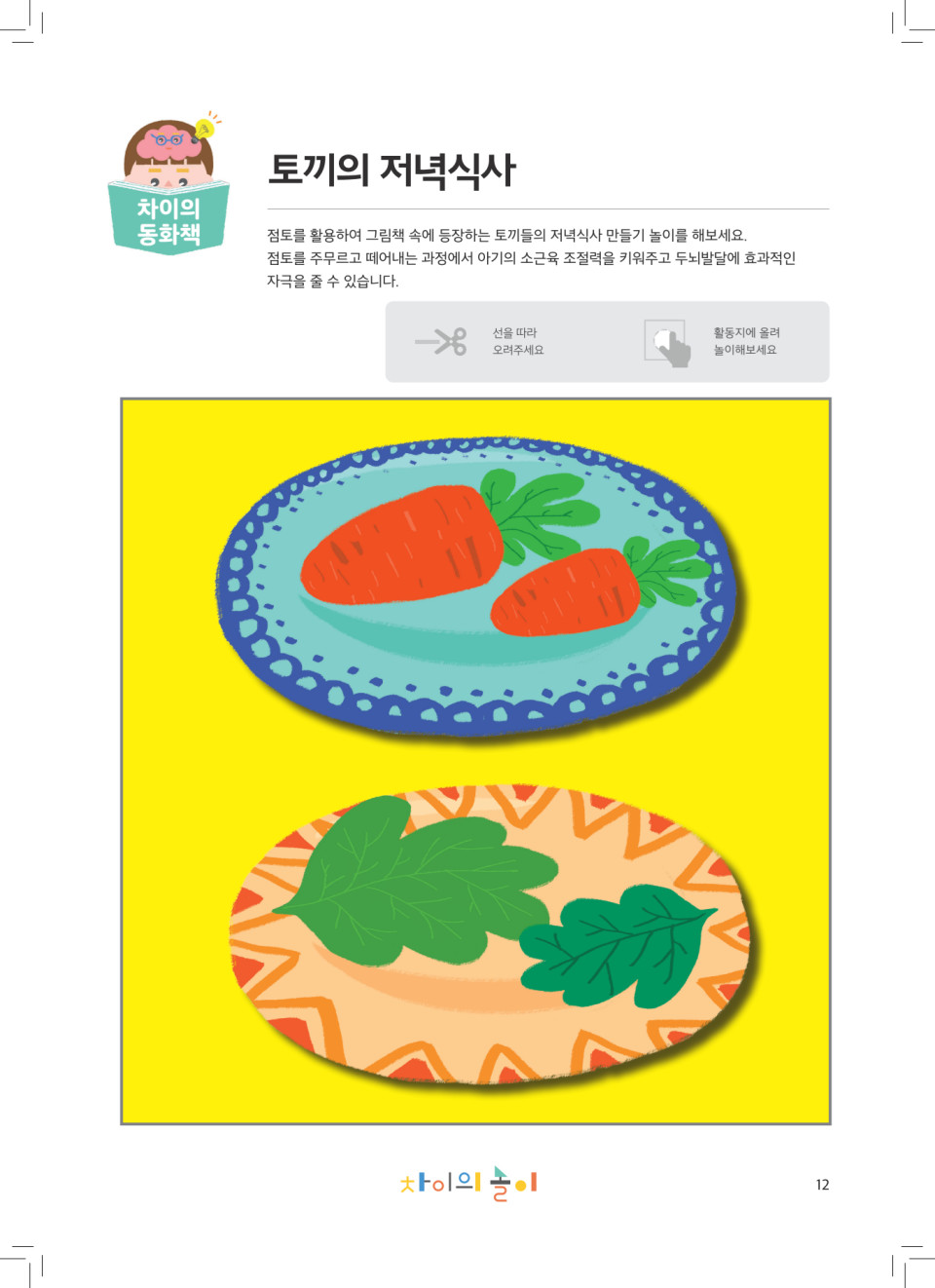 ![]() | (아기의 손을 잡고 활동지 위에 점토를 올리며) 토끼 접시 위에 음식을 올려줄까? 토끼야 많이 먹으렴. |