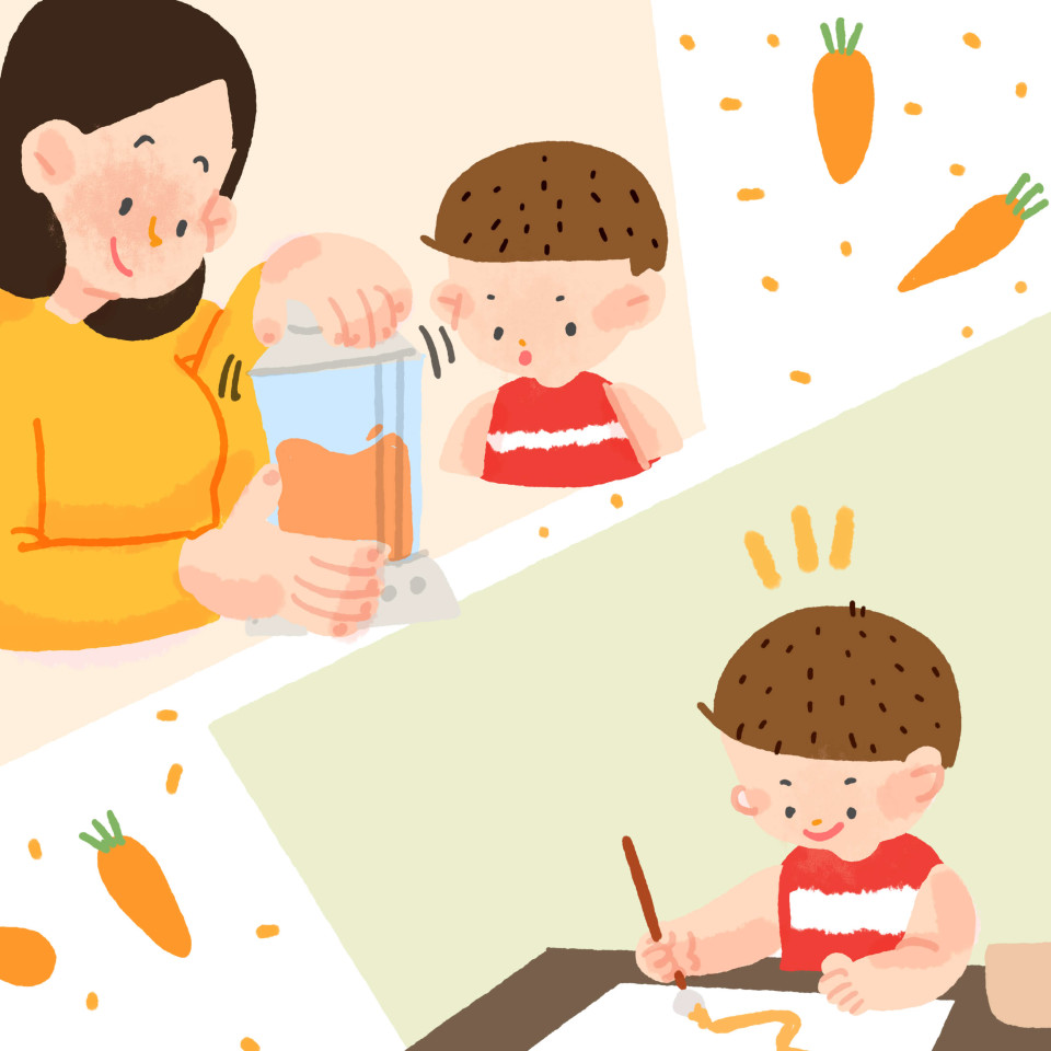 물감 대신 당근을 갈아 물감 놀이를 해보세요.