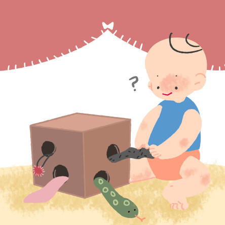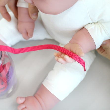 - 아기가 방울을 잡으며 엄마 쪽으로 천천히 방울을 잡아당깁니다.