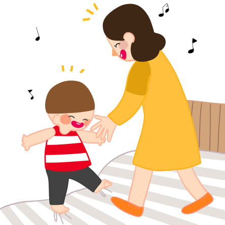 - 아이가 관심을 가지며 아이의 손을 마주 잡고 함께 몸을 움직여봅니다.오른쪽, 왼쪽, 앞뒤로 다양하게 움직일 수 있도록 이끌어주세요.