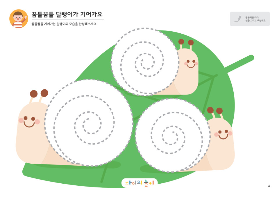 ![]() | 빙글빙글 선을 따라 그려서 달팽이 그림을 완성해볼까? |