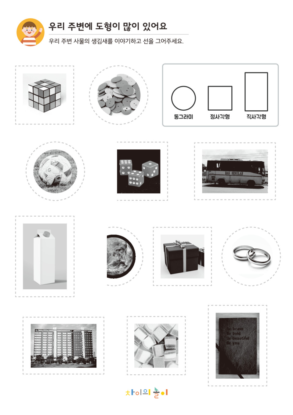 다양한 사물의 형태와 도형의 특징과 대응하며 인지 능력을 기르고 입체도형에 대해 친숙함을 느낄 수 있습니다.