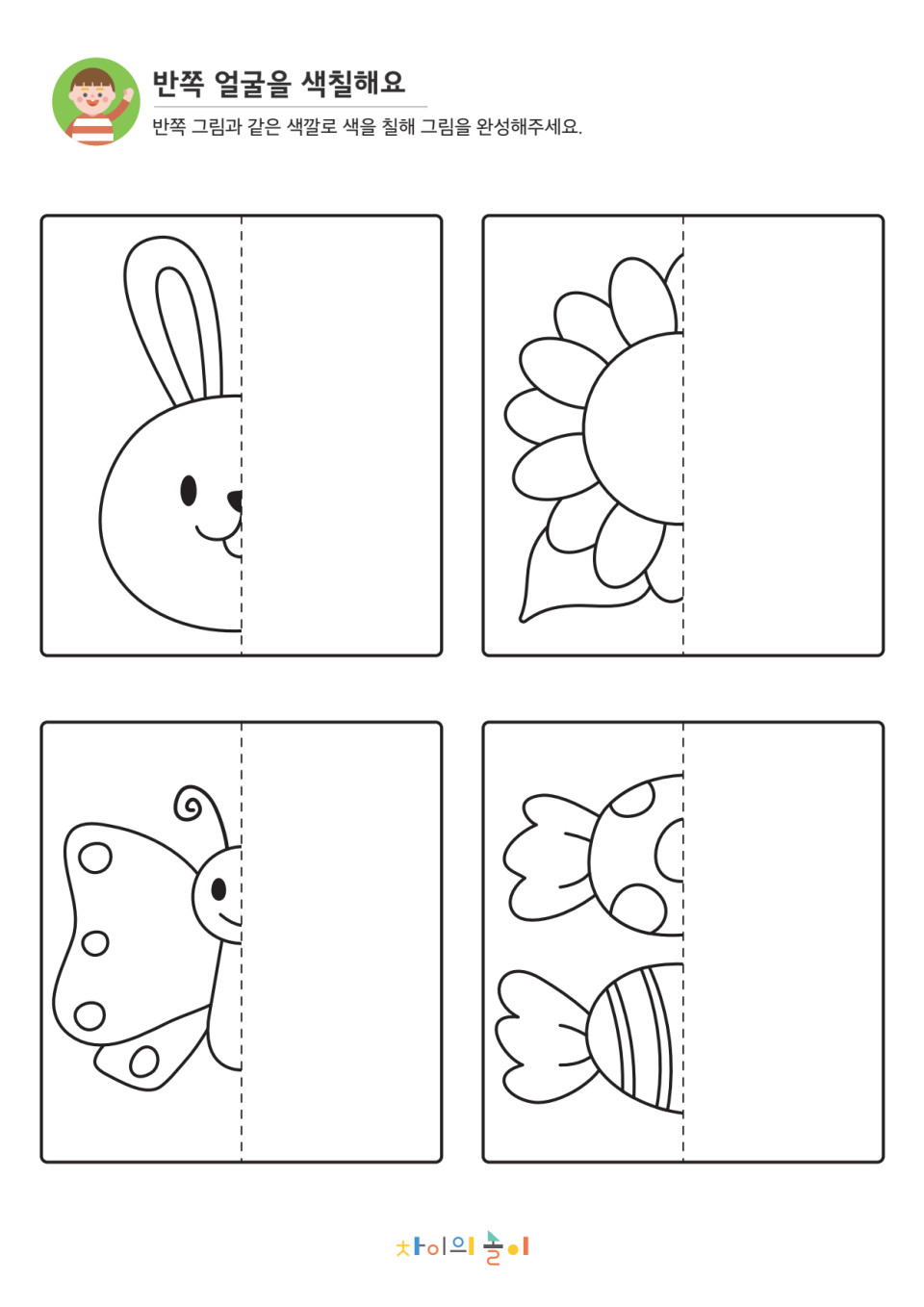 반쪽 얼굴을 색칠하며 대칭에 대한 개념을 이해할 수 있습니다.