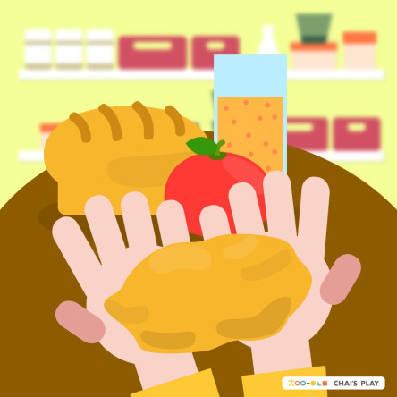 ![]() | Iya! Kalau gitu, Chai masukkan makanan yang ada di gambar ini sesuai dengan keranjangnya masing-masing! |