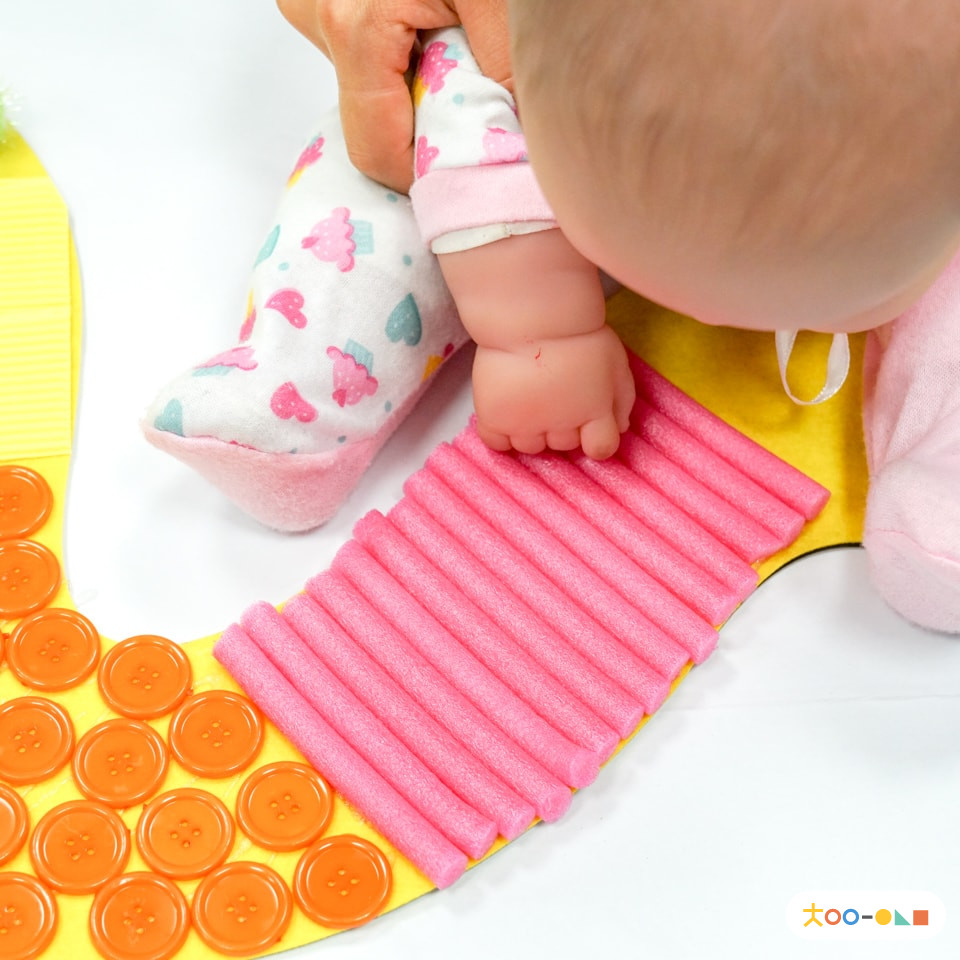 아기 뱀의 알록달록한 색깔과 서로 다른 느낌이 감각 발달을 도모하고, 재미있는 소리가 호기심을 자극해 인지 발달을 돕습니다.