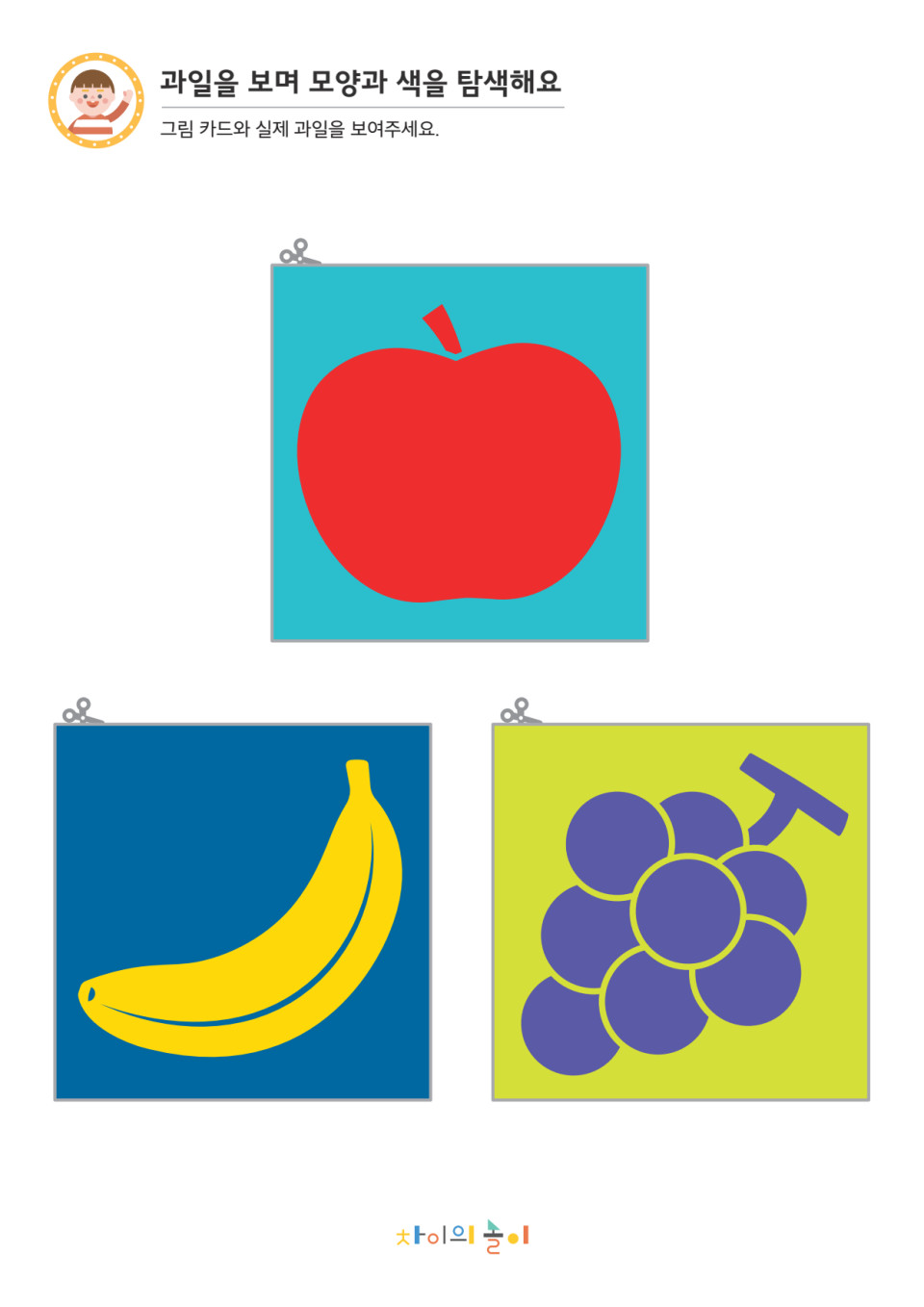 활동지, 과일(사과, 바나나, 포도), 가위 (도화지에 인쇄하거나 코팅을 하면 오래 사용할 수 있어요)놀이 방법