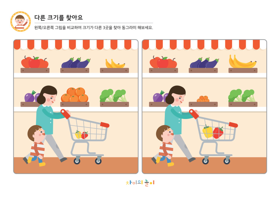 그림 속 크기가 다른 대상을 찾아보고 같거나 다른 그림의 변별하며 관찰력, 집중력을 기르고 성취감을 느낍니다.