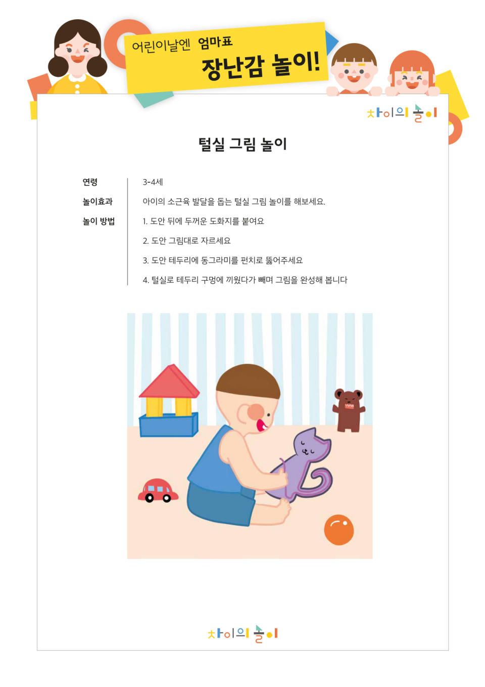- 차이의 놀이의 모든 콘텐츠는 아이를 돌보고 기르는 모든 양육자 분들을 대상으로 한 콘텐츠 입니다. 아이를 기르는 주 양육자는 아빠, 엄마, 조부모님, 돌봄 선생님 등 각 가정의 상황에 따라 다를 수 있습니다. 다만, 매 콘텐츠마다 각 양육 상황을 고려하여 모두 기재하기에는 어려움이 있어 '엄마'로 표기하여 설명드리는 점이 있습니다. 차이의 놀이의 콘텐츠는 엄마가 주로 양육을 해야 한다는 의미로써 엄마를 주로 언급하여 표기하는 것은 아닌 점 꼭 참고해 주시기 바랍니다.