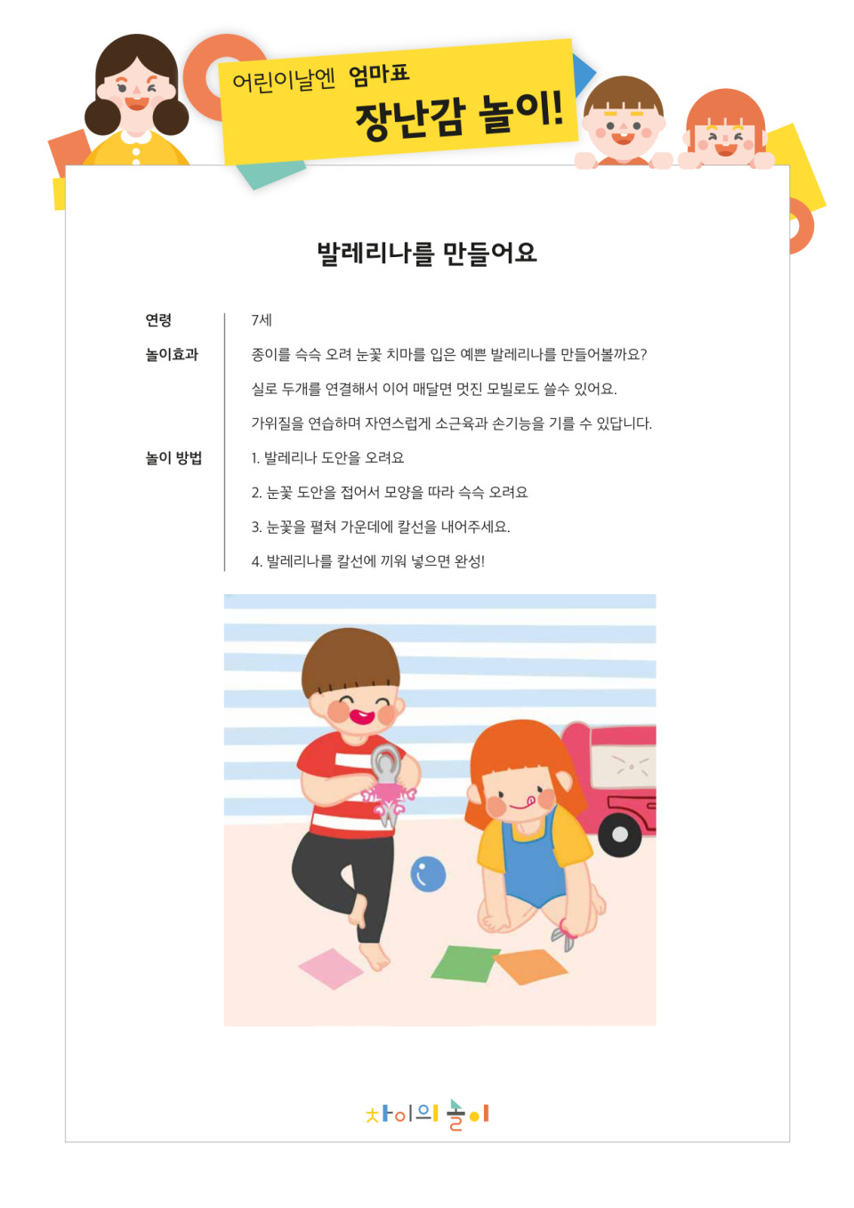 - 차이의 놀이의 모든 콘텐츠는 아이를 돌보고 기르는 모든 양육자 분들을 대상으로 한 콘텐츠 입니다. 아이를 기르는 주 양육자는 아빠, 엄마, 조부모님, 돌봄 선생님 등 각 가정의 상황에 따라 다를 수 있습니다. 다만, 매 콘텐츠마다 각 양육 상황을 고려하여 모두 기재하기에는 어려움이 있어 '엄마'로 표기하여 설명드리는 점이 있습니다. 차이의 놀이의 콘텐츠는 엄마가 주로 양육을 해야 한다는 의미로써 엄마를 주로 언급하여 표기하는 것은 아닌 점 꼭 참고해 주시기 바랍니다.