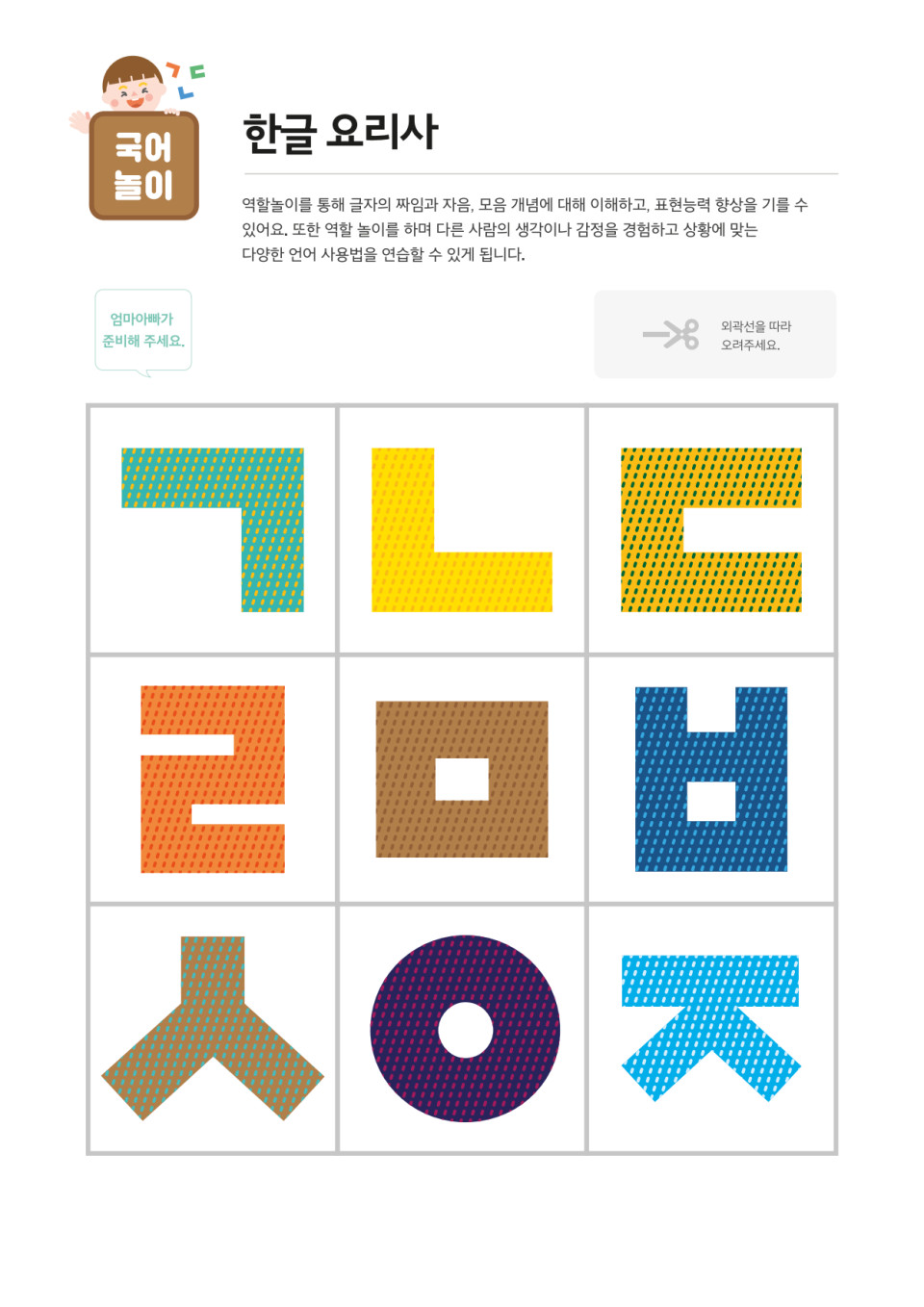 자모음 카드는 요리기구 안에 들어갈 수 있는 크기이면 좋아요.