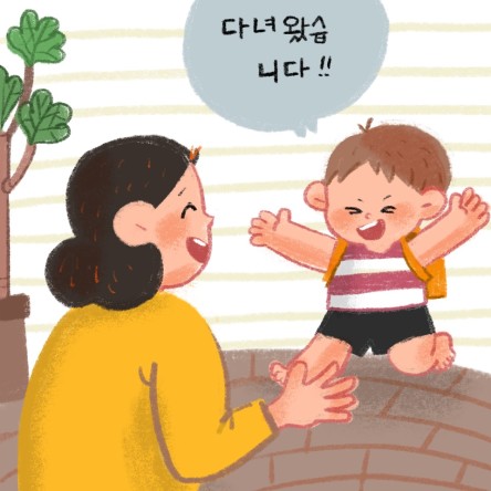 아이 몰래 출근하거나 단순히 “엄마 아빠 다녀올게”라는 심심한 작별 인사가 아닌 우리 가족 만의 특별한 작별 의식을 하나씩 만들어보세요. 예를 들어 목마 태워주기, 서로의 엉덩이를 부딪히며 인사하기, 이마-볼-코-입 순서대로 뽀뽀하기 등 특별한 작별 의식을 통해 아쉽고 슬픈 감정이 아닌 즐거움을 느끼고, 다시 만나는 때를 기대하게 만듭니다. 퇴근 후 다시 만났을 때에도 또 다른 만남 의식으로 반갑게 인사를 나누어보세요. 특별하고 재미있는 의식으로 부모와의 신뢰감을 높임으로써 끈끈한 애착 관계를 유지할 수 있습니다.